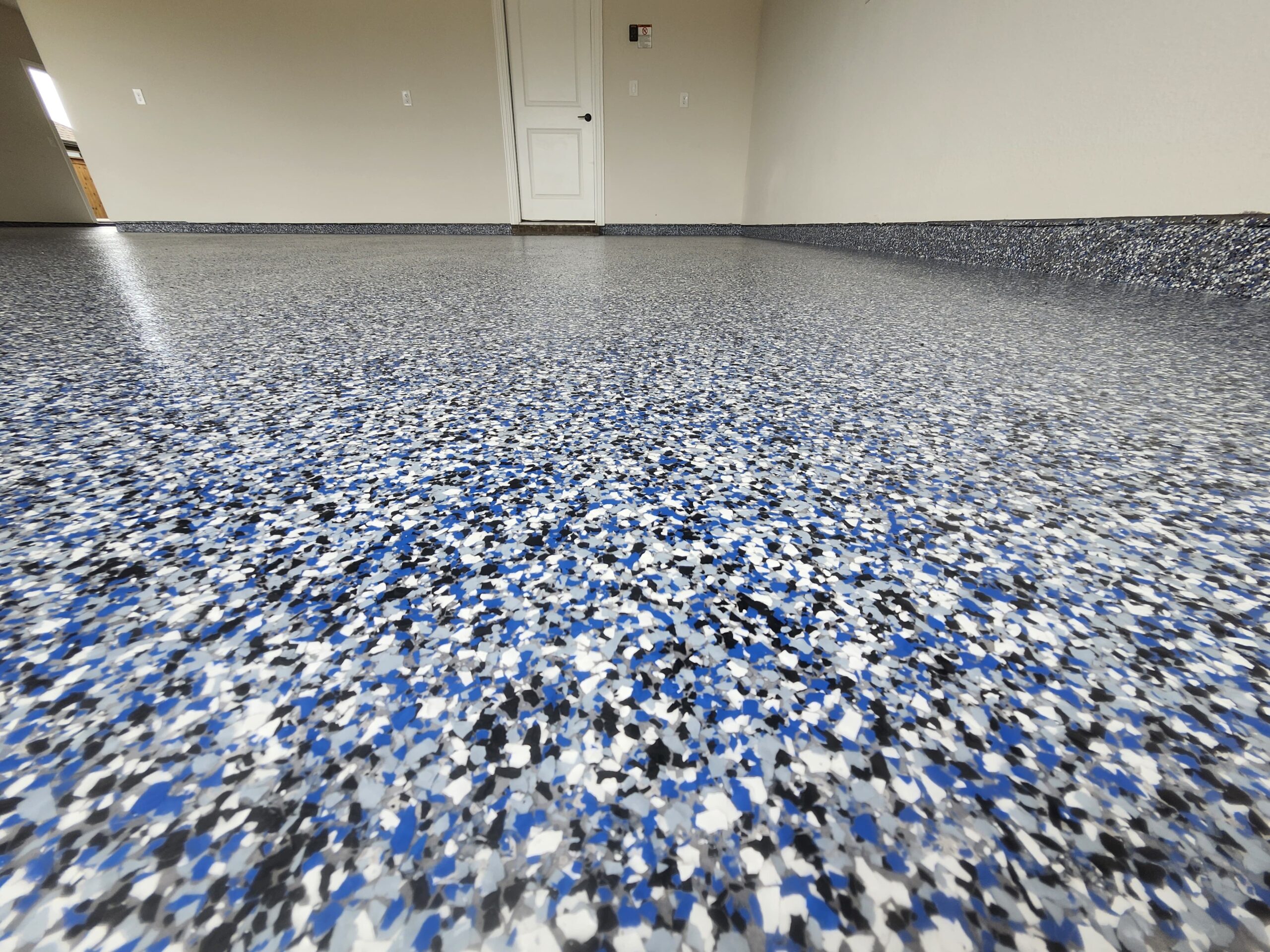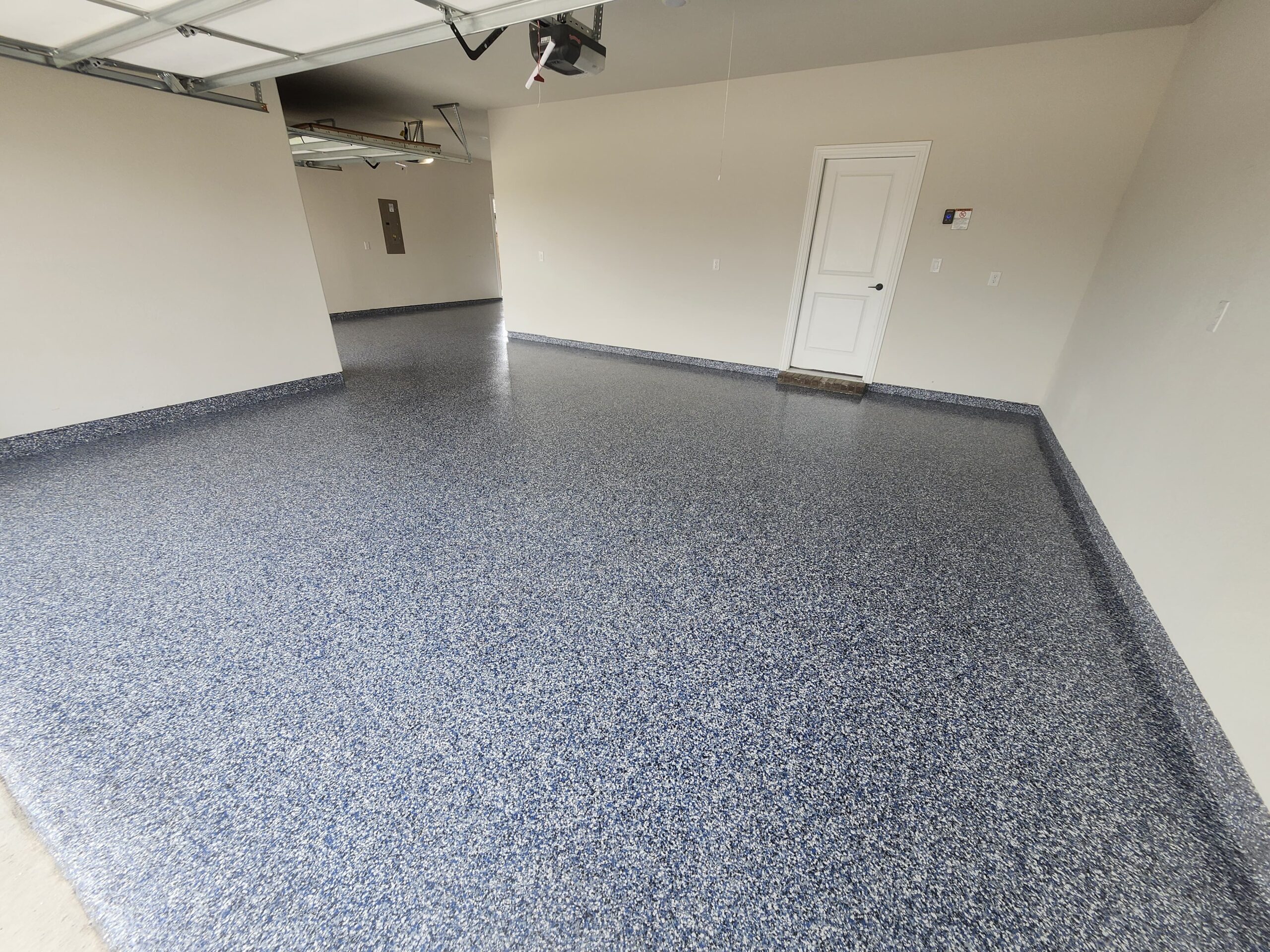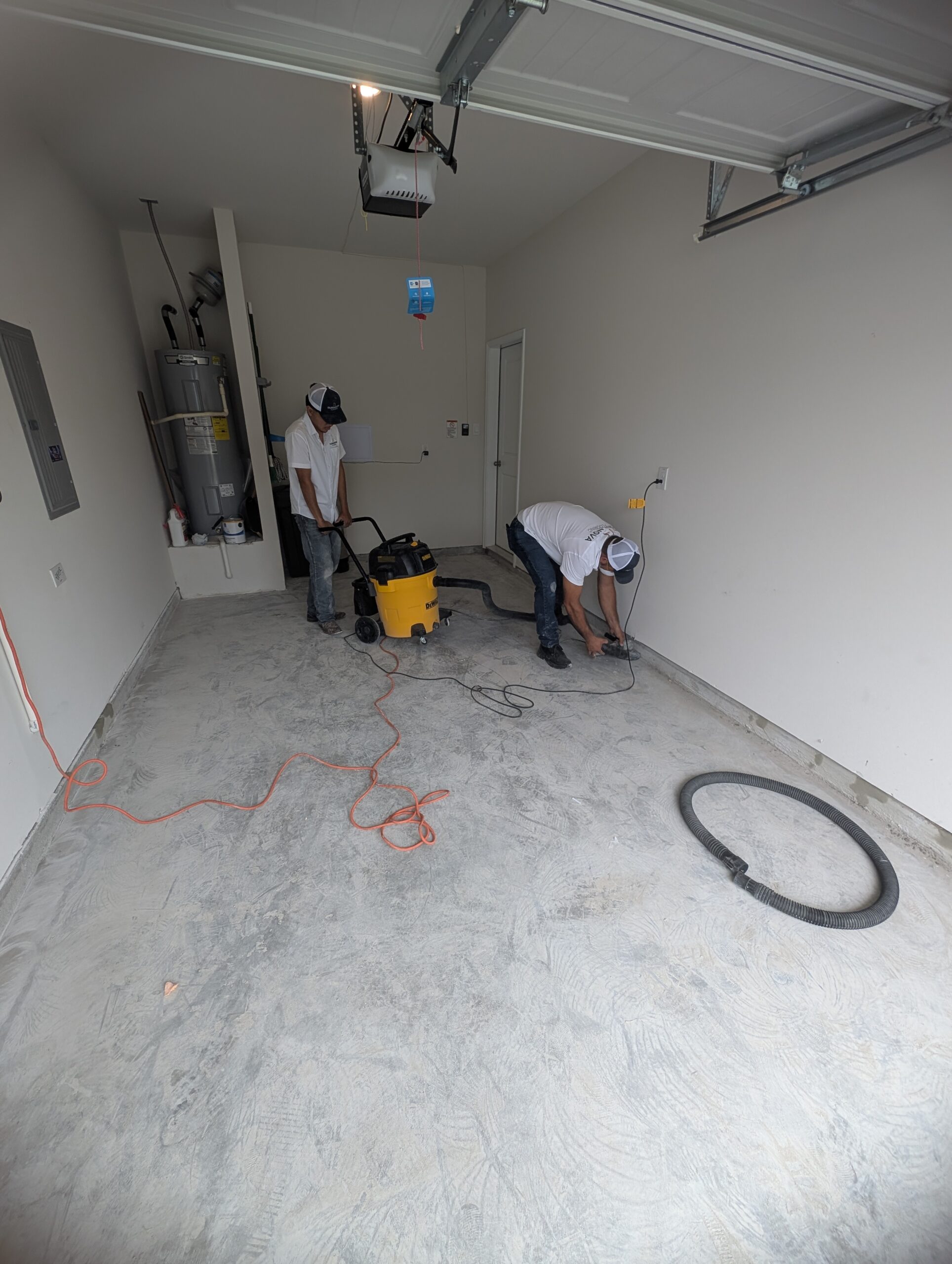 - Day 1 – Surface Preparation: We grind the entire concrete surface using diamond discs—an essential step to ensure long-term durability. Cracks and imperfections are repaired to achieve the smoothest possible finish. We then apply a 100% solid epoxy coating with a built-in vapor barrier, followed by a full broadcast of decorative flakes. With over 15 colors available, customers can choose the perfect look. After curing, we remove the excess flakes to prepare for the top layer.