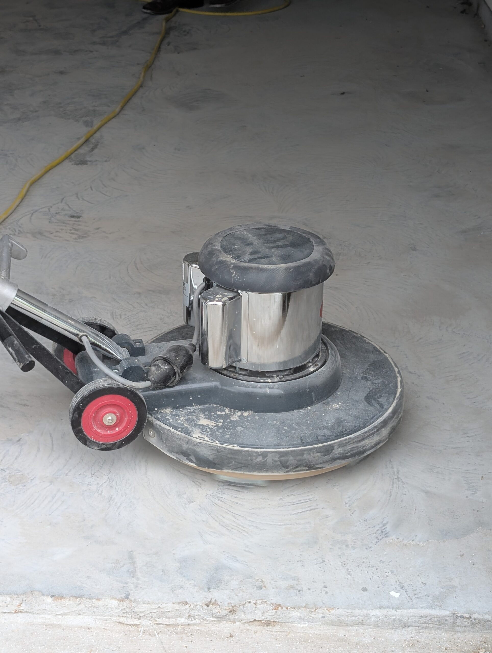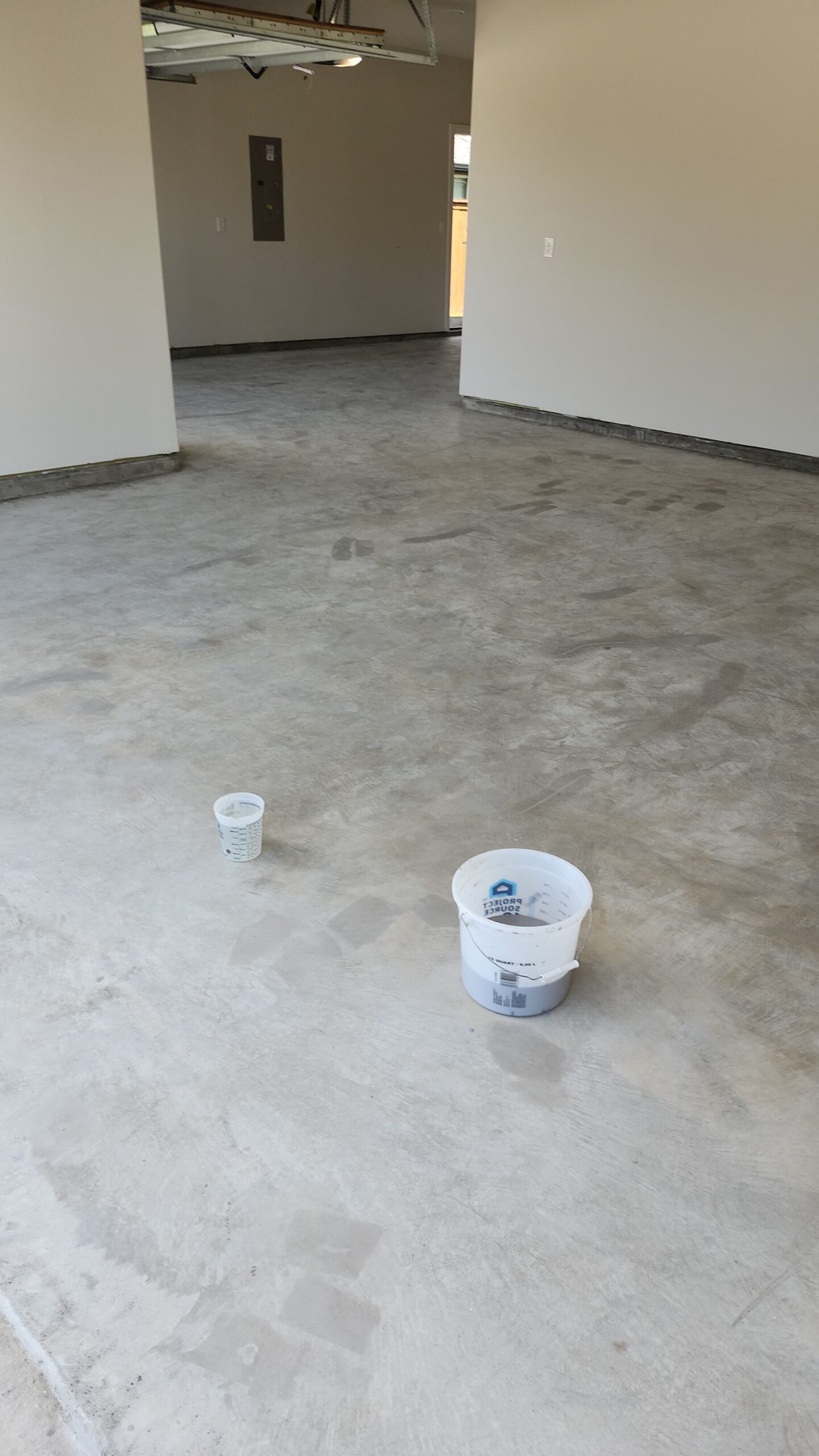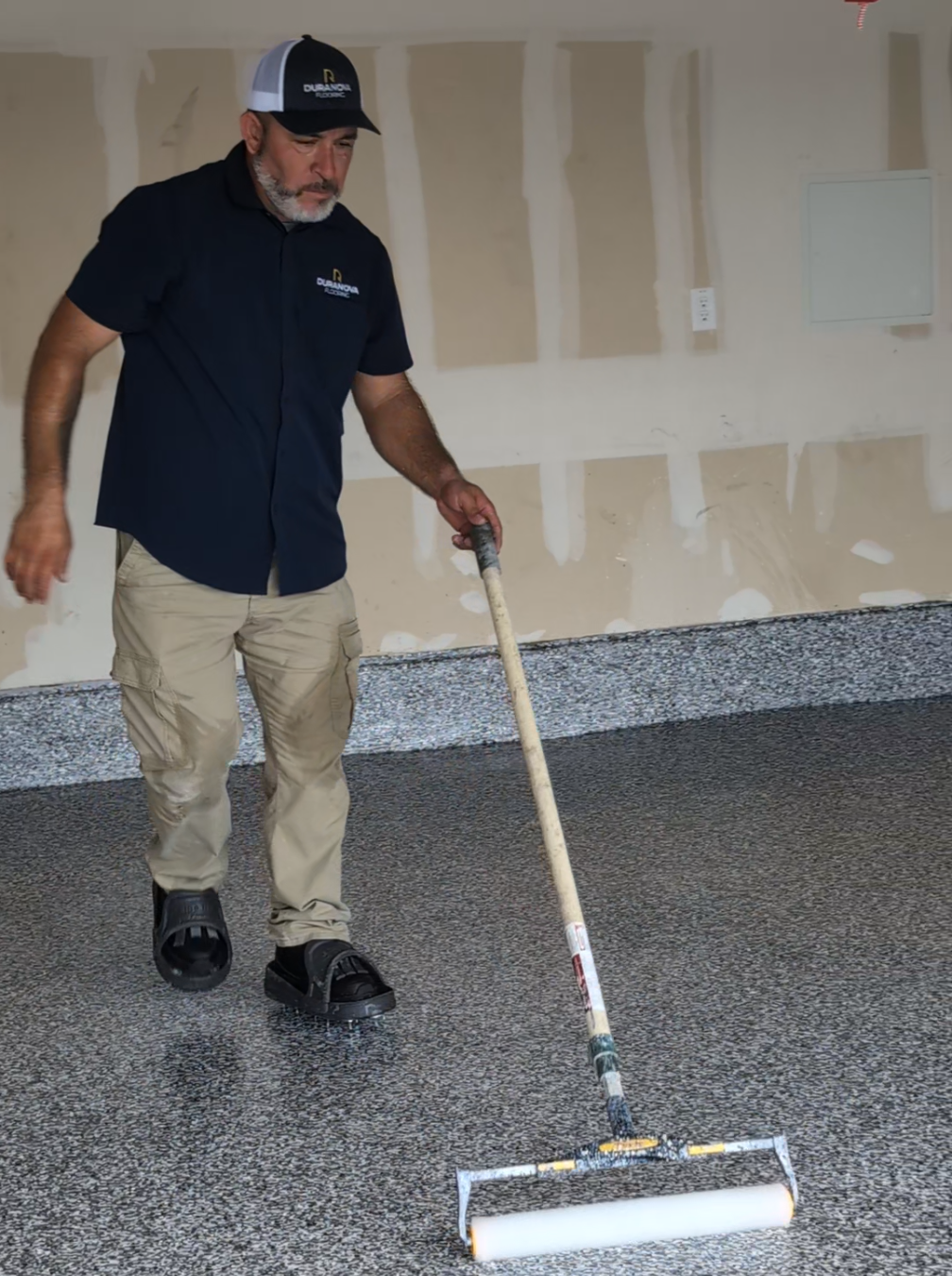 - Day 1 – Surface Preparation: We grind the entire concrete surface using diamond discs—an essential step to ensure long-term durability. Cracks and imperfections are repaired to achieve the smoothest possible finish. We then apply a 100% solid epoxy coating with a built-in vapor barrier, followed by a full broadcast of decorative flakes. With over 15 colors available, customers can choose the perfect look. After curing, we remove the excess flakes to prepare for the top layer.